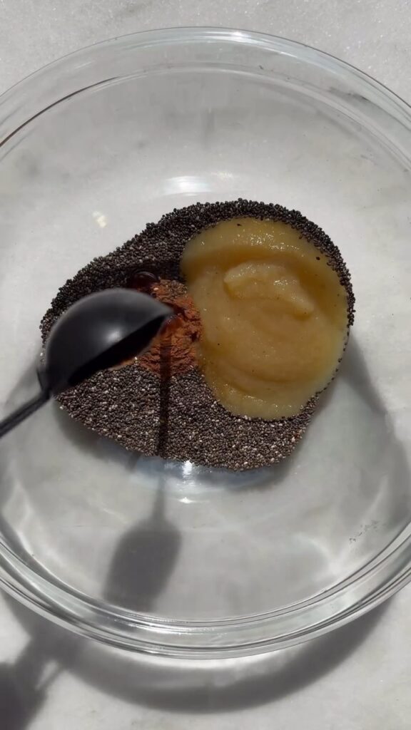 2. Add the chia: Pour the apple puree mixture into a jar or bowl, then add the chia seeds right into it.