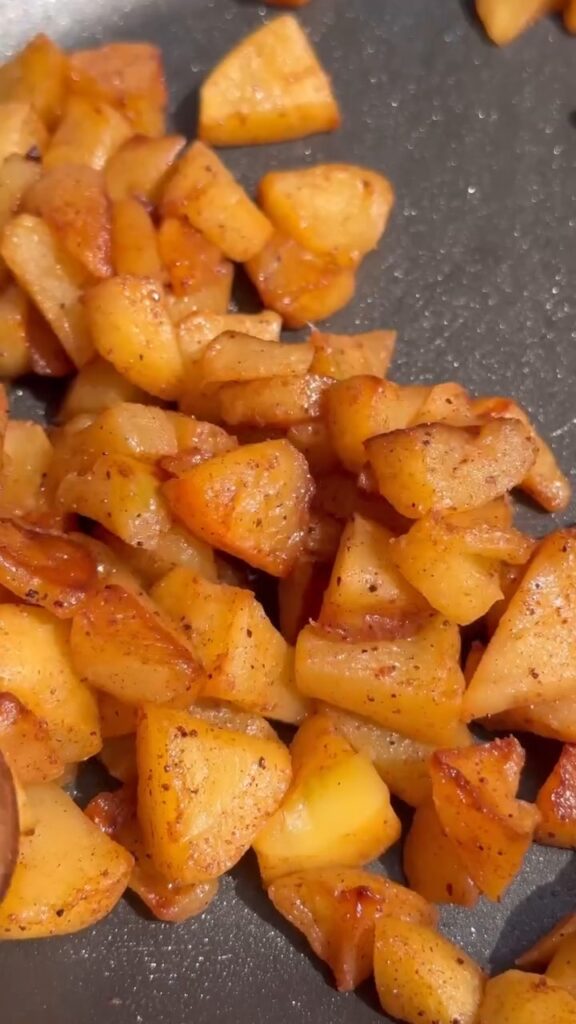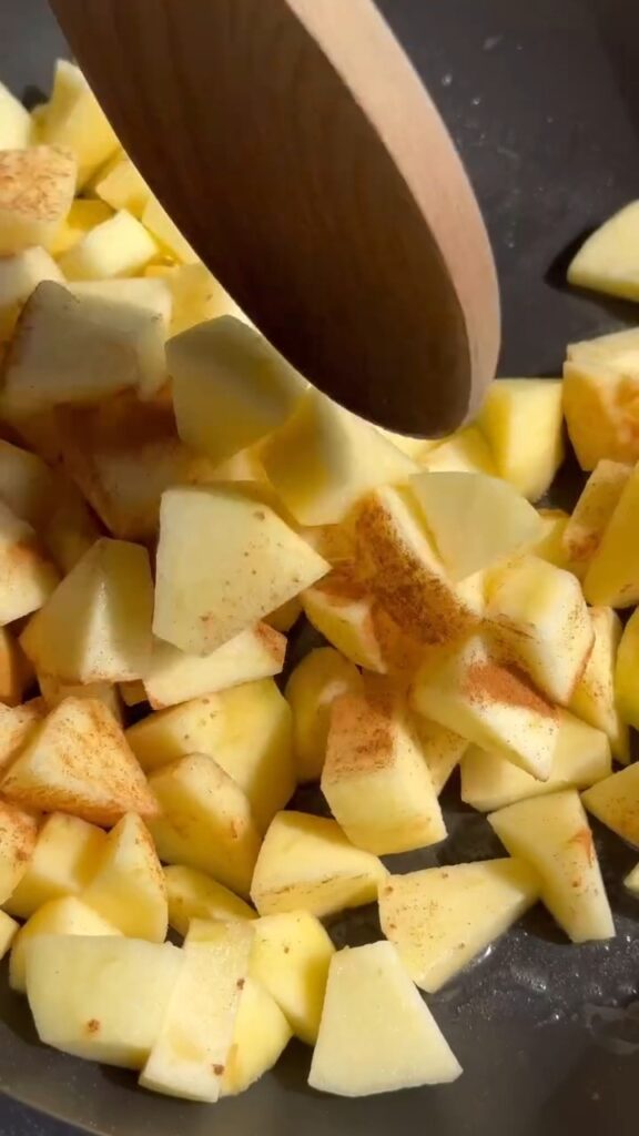 5. Caramelize the apples: When you’re ready to serve, toss the sliced apples into a hot pan with a little butter, a sprinkle of cinnamon, and a drizzle of maple syrup. Stir them around over medium heat until they turn golden, soft, and beautifully caramelized—your kitchen will smell absolutely incredible!