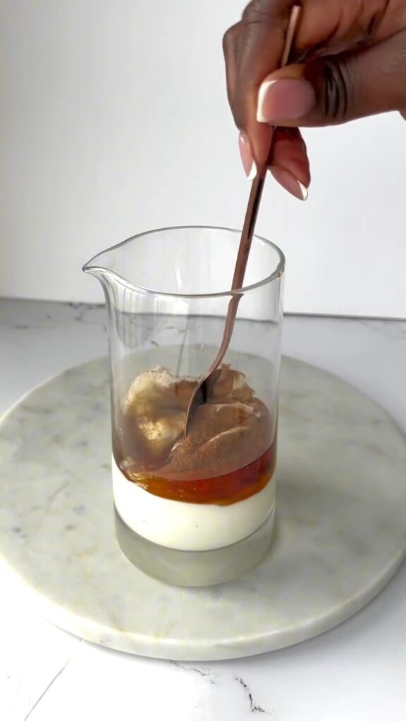 - In a separate jug or bowl, mix the yoghurt, vanilla paste, maple syrup, honey, milk, and cinnamon until smooth.