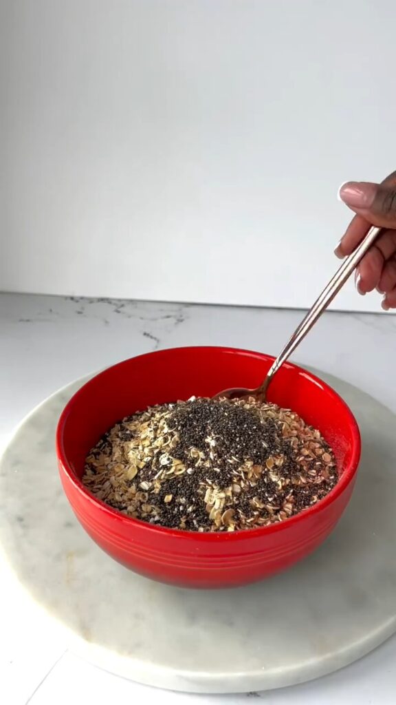 - In a medium mixing bowl, combine the oats and chia seeds and stir to distribute evenly.