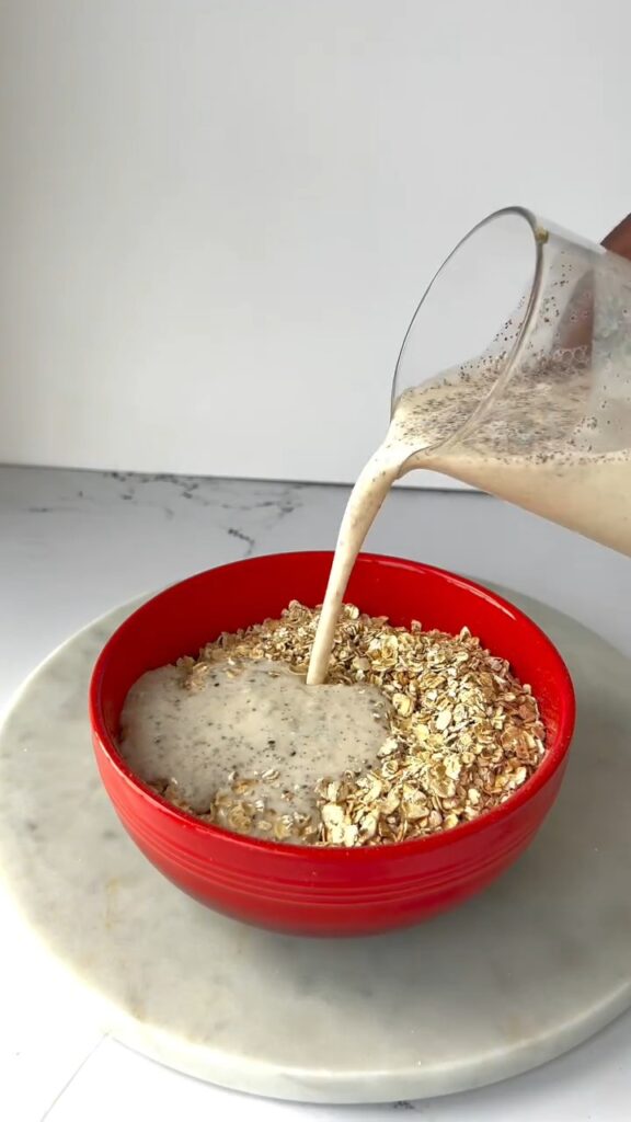 - Pour the wet mixture over the oats and chia seeds, then stir until all of the oats are fully coated and soaked.