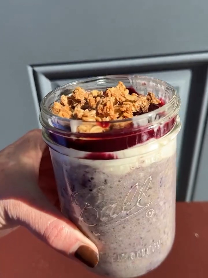 5. Enjoy: In the morning, give it a quick stir, add a layer of blueberry jam and a sprinkle of granola if you’re feeling fancy, and dig in!