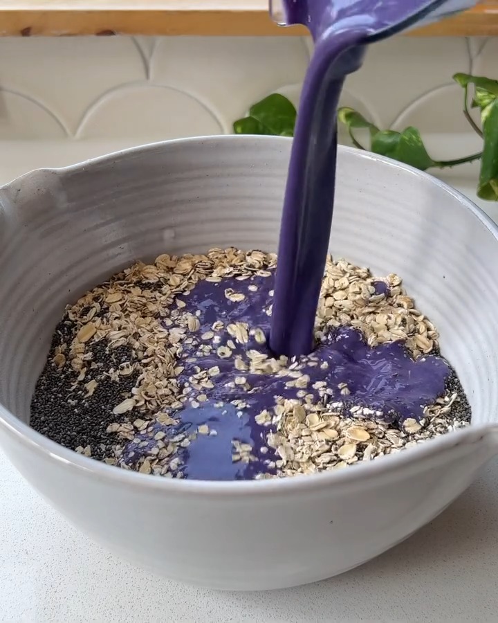 3. Pour the blended mixture over the oats and chia seeds and mix everything together well.