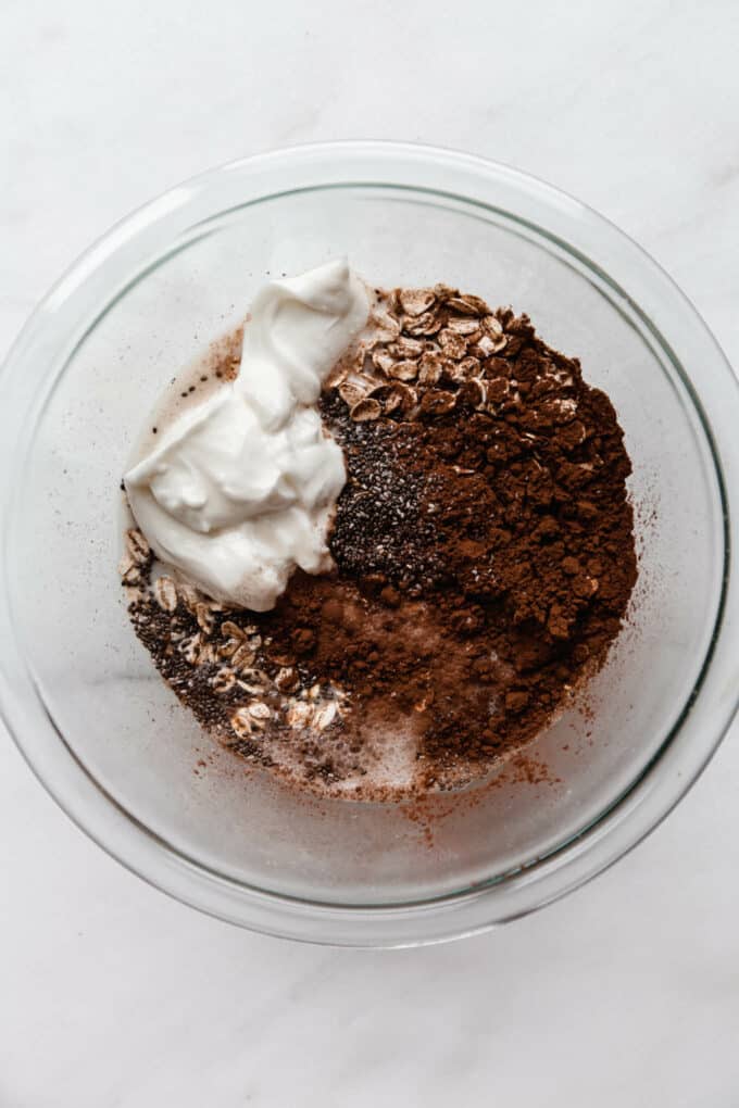 1. Mix the dry ingredients: In a jar or container, combine the oats, cocoa powder, and a pinch of salt. Give it a quick stir to make sure everything’s evenly distributed.