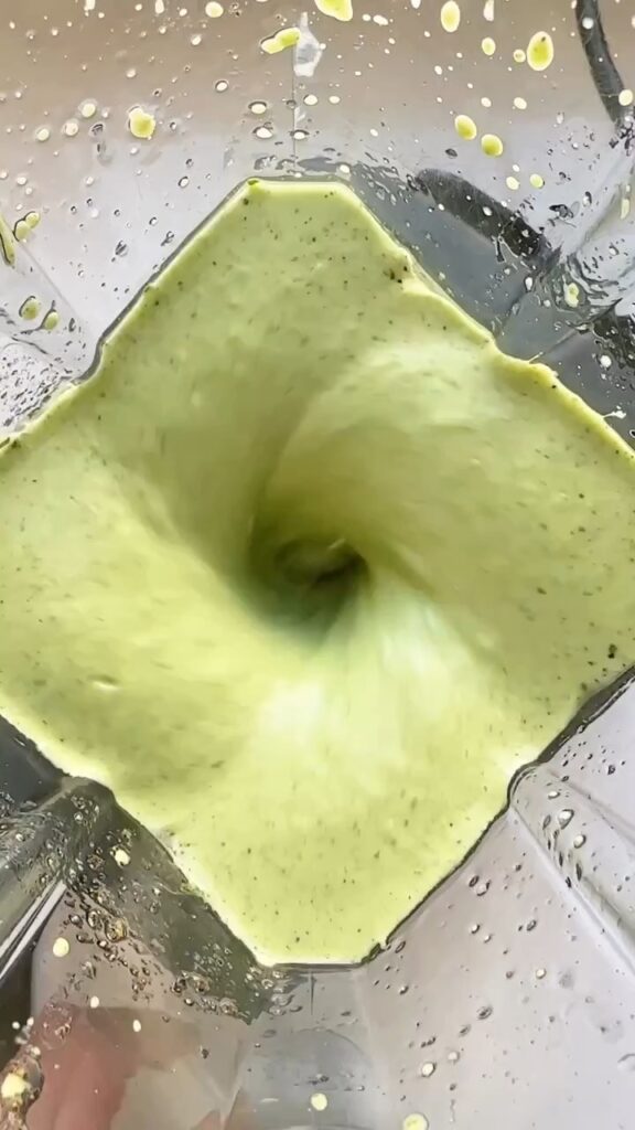 Blend on high for 30–45 seconds until the dressing reaches a smooth, uniform consistency. The color transforms quickly — within seconds you’ll see it turn a beautiful, vibrant green as the cilantro fully incorporates into the oil and lime juice.