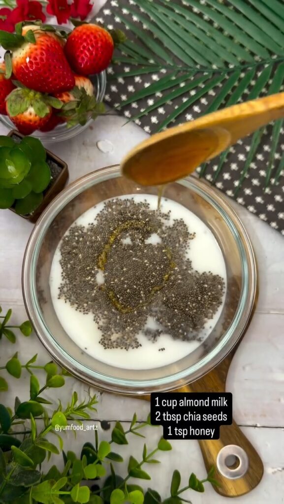- Combine the almond milk, chia seeds, and sweetener in a bowl or jar and stir well.