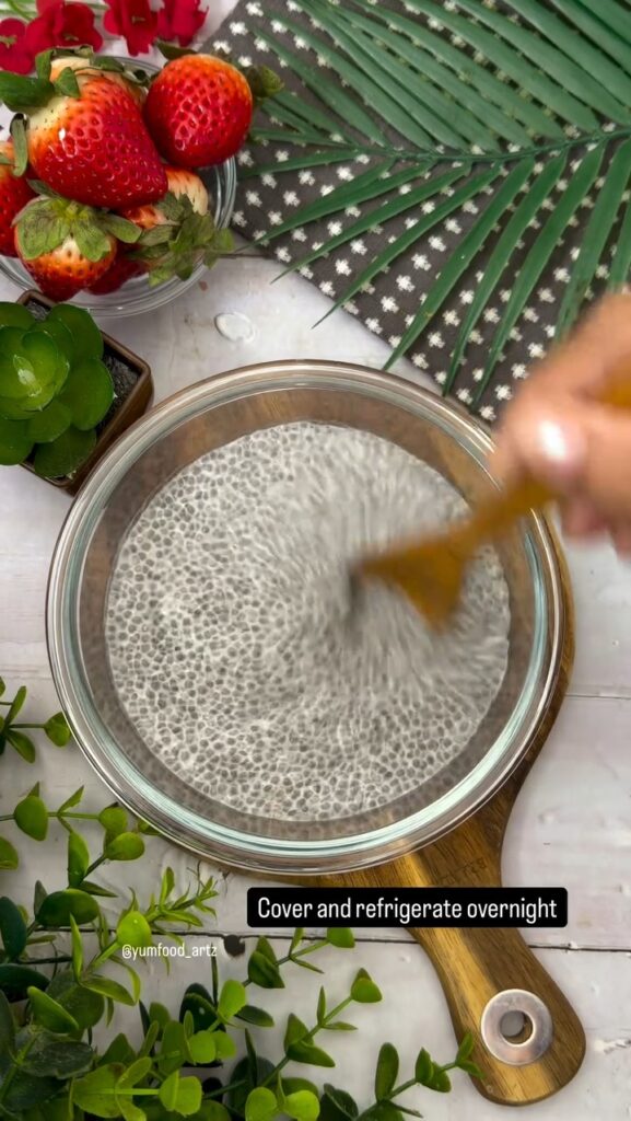 3. Cover and refrigerate for at least 2–4 hours. Overnight works even better. By morning, the chia seeds fully expand and the pudding sets into a thick, creamy consistency.