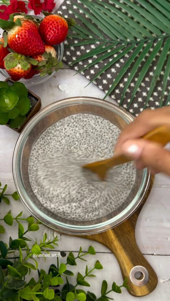 2. Let it sit for 5 minutes, then stir again. This second stir is important — it breaks up any clumps that start forming as the chia seeds absorb liquid.