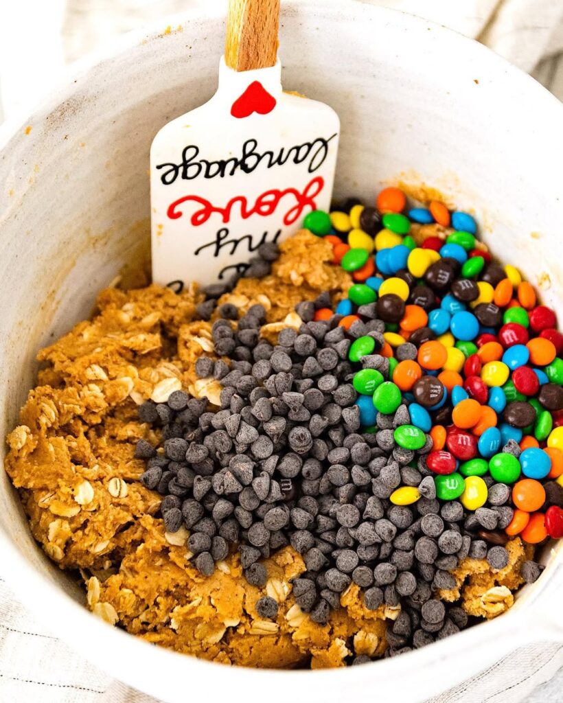 3. Fold in the goodies: Gently mix in the mini chocolate chips and M&Ms. Don’t be shy—the more, the merrier!