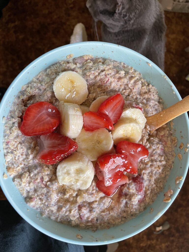 5. In the morning, give it a stir, add more milk if needed, and top with extra strawberries or banana slices if you’re feeling fancy.