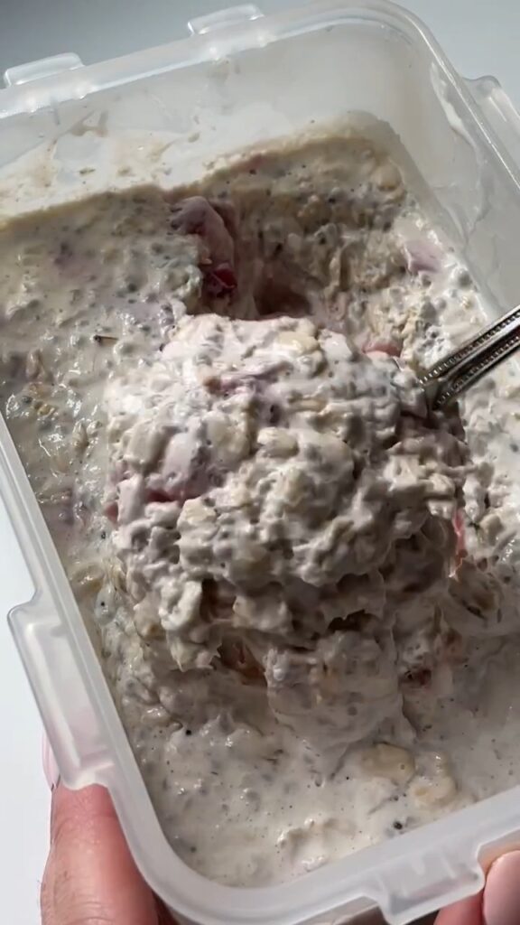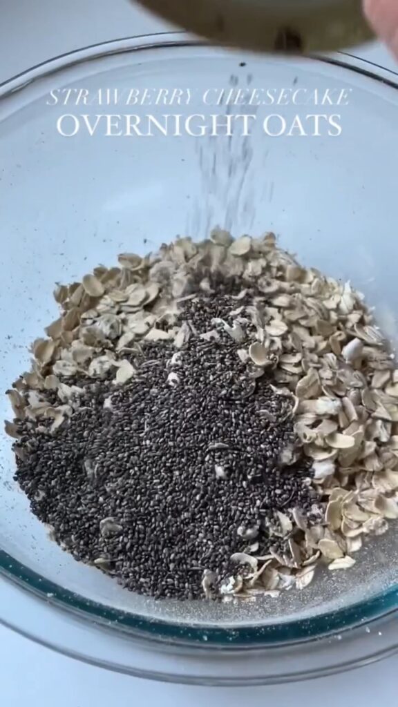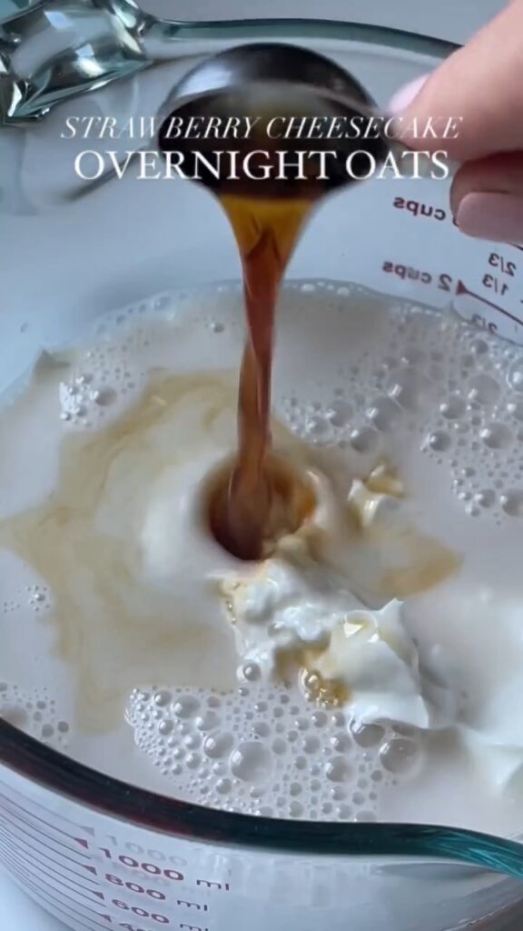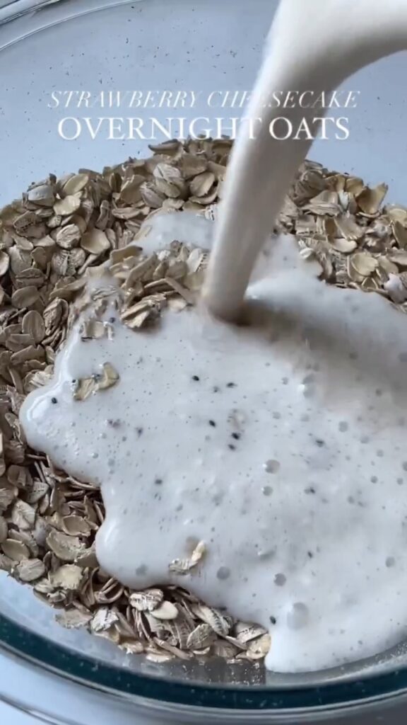 5. Enjoy: In the morning, give it a stir, add your toppings (more strawberries, maybe some crushed graham crackers for that cheesecake crust vibe), and dig in.