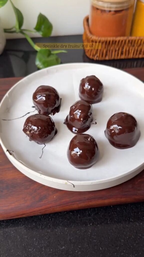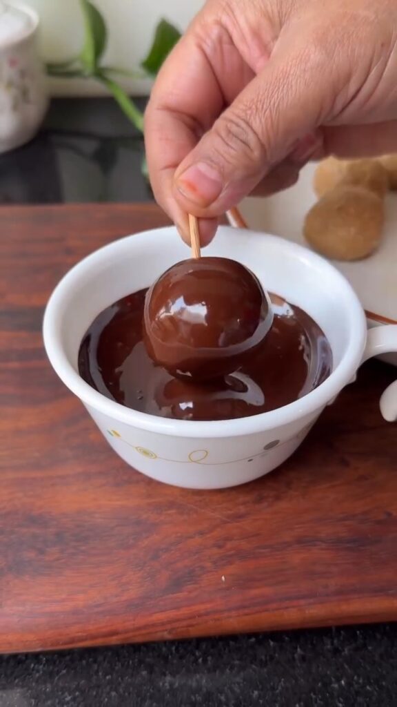 - Dip each ball into the melted chocolate, coating it evenly all over.